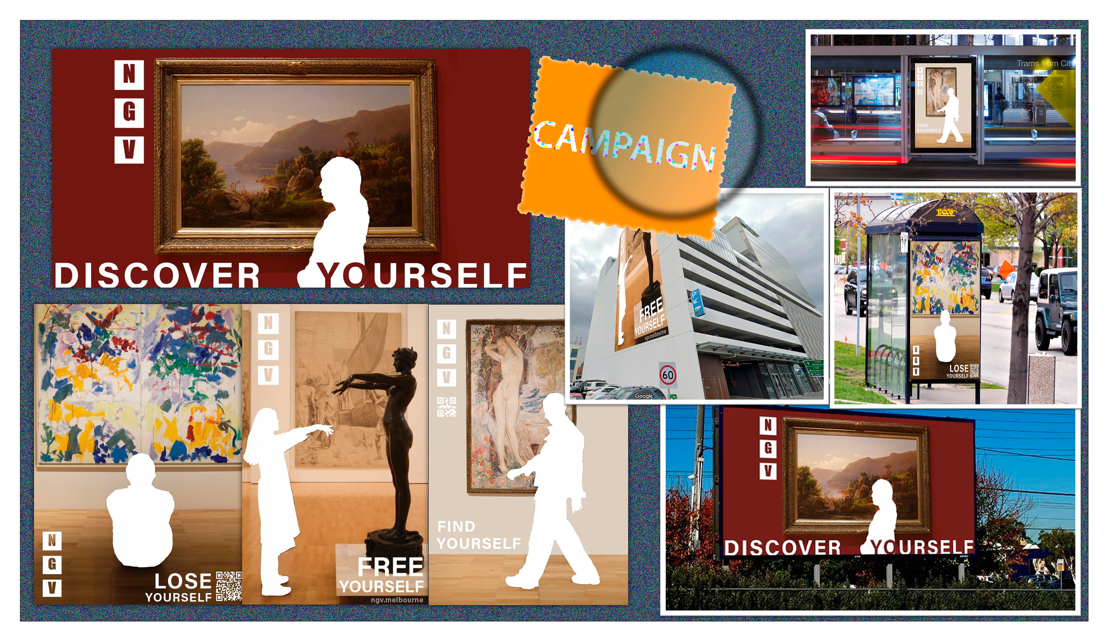 This campaign included 4 billboards made for NGV in the Advertising Foundation course. I'm one of the art directors for the NGV campaign. The idea is to showcase the feeling of young people going to the exhibition. The artworks in the gallery are the spirit of Victoria. The National Gallery welcomes everyone who loves art to enjoy, explore, and find their place. The art direction focuses on shaping the connection between people and art.. We create a blank space for visitors to fit in when they are finding, walking around the exhibition space.